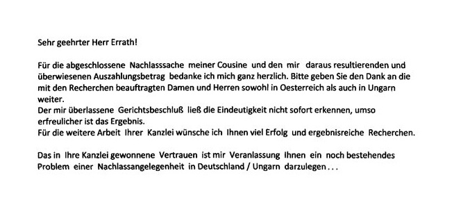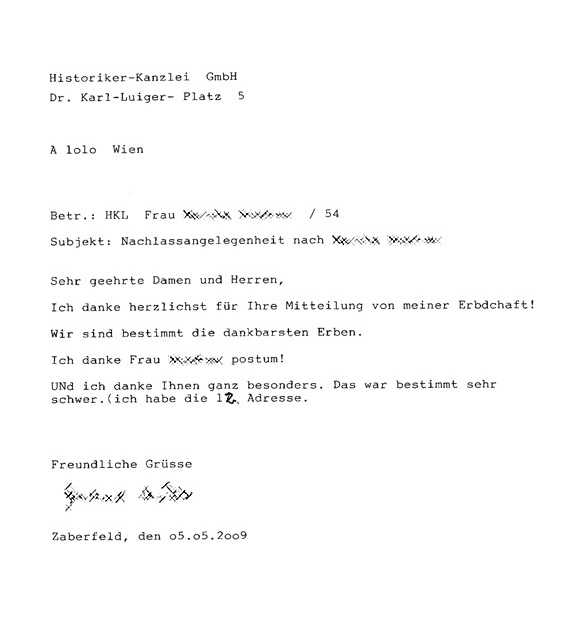 Dear Ladies and Gentlemen, Dear Mr. Mag. Brandweiner, Many thanks to the Historikerkanzlei for the successful efforts in the estate matter XXXXX. With kind regards