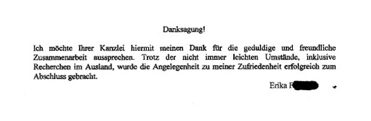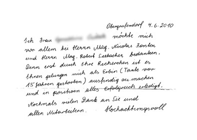 Dear Mr. Mag. Unger! That is more than alright! My joy is incredible. For so long I have tried unsuccessfully to find her before I finally got the tip from your law firm. Should I come to your law firm to settle the costs or give me the account number and I will transfer it to you? I’m bursting with curiosity to contact her!!! Thank you very, very much for your quick help. With kind regards.