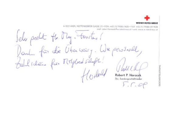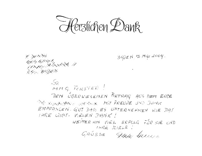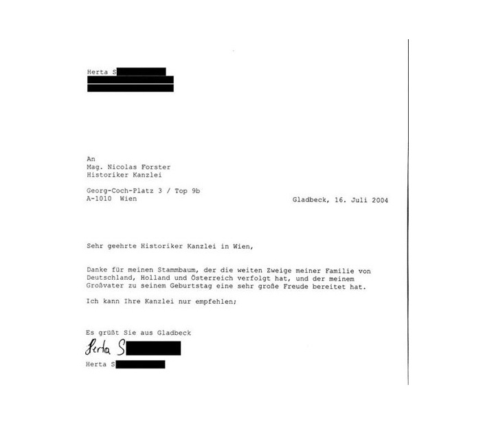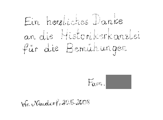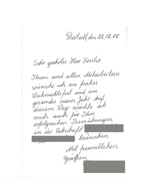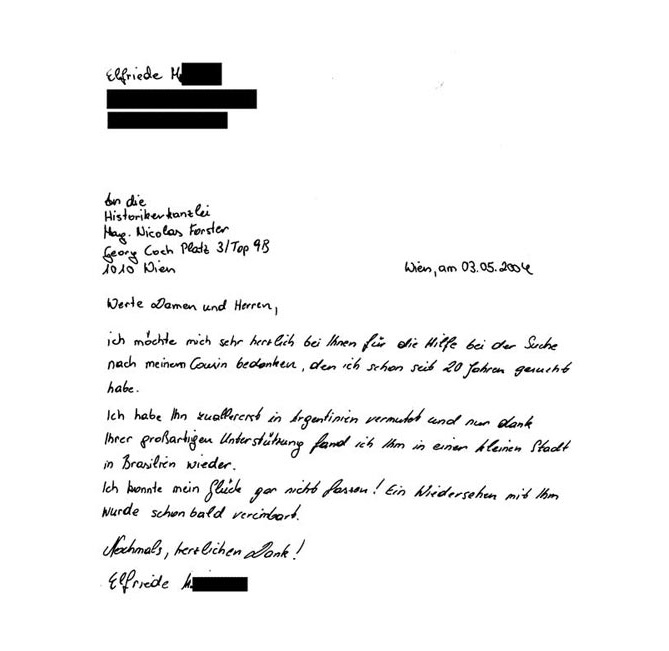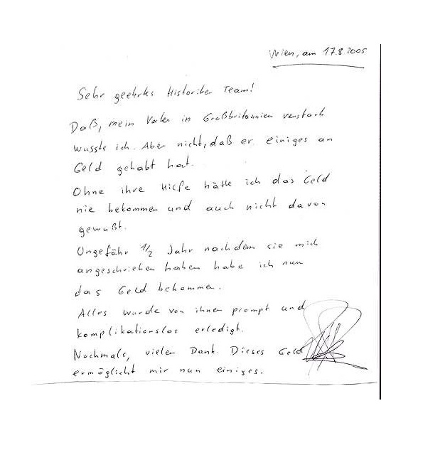 Dear Mag. Unger! I want to thank you for all your efforts and patience regarding the settlement of my grandfather’s estate. I spoke with the (…) family this week and they said they were following up with your requests to possibly receive their share of the estate. I only hope the third family can do the same. I know their situation is more complicated but I do believe they can settle as well. I am hoping for the best. Sincerely,