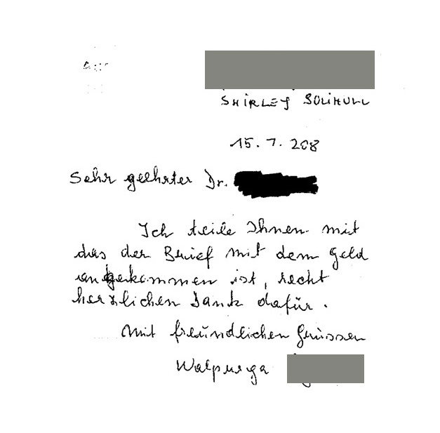 Dear Dr. … I inform you that the letter with the money has arrived. Thank you very much for that.